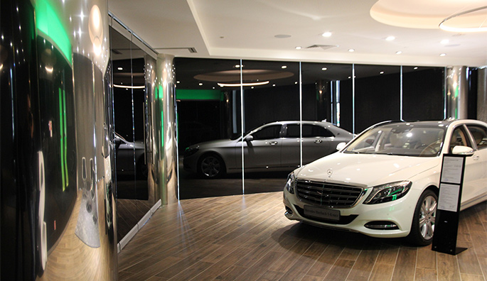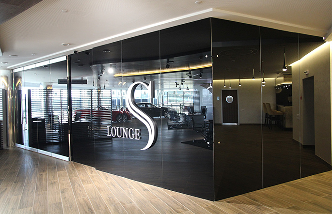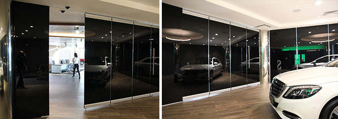 Зона S-lounge для демонстрации автомобилей S-класса оформлен черным триплексом, который применили в цельностеклянных перегородках NAYADA-Hufcor G-3000 и автоматической двери. Сервисную зону отделили от основного зала шоурума противопожарной перегородкой NAYADA-Fireproof EIW-45.