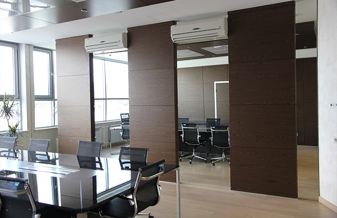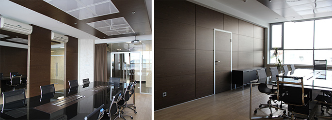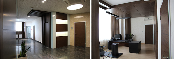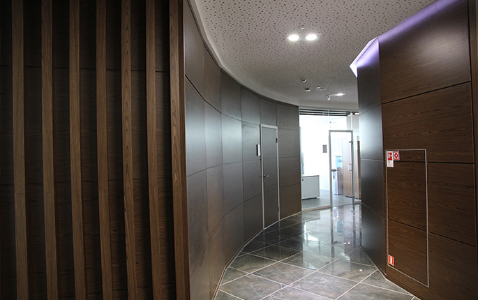 Центральное ядро офиса было решено сделать в шпоне, система Regina Line. Офисная зона расположена по кругу от центрального ядра с техническими помещениями. Все кабинеты, зона рецепции и коридоры выглядят строго и представительно за счет облицовки стен и колонн радиусными шпонированными панелями NAYADA-Regina. На потолке по радиусу через все помещения проходят декоративные шпонированные балки.