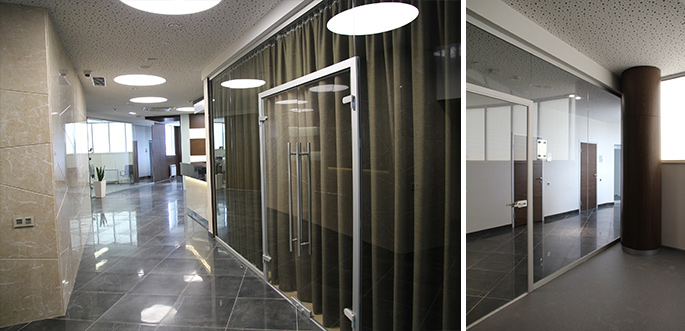 Офисную часть кабинетов разделили стеклянными перегородками, сохранив воздушность, не заглушая пространство.