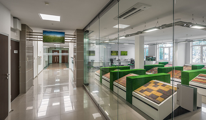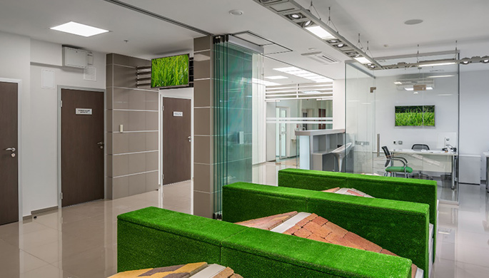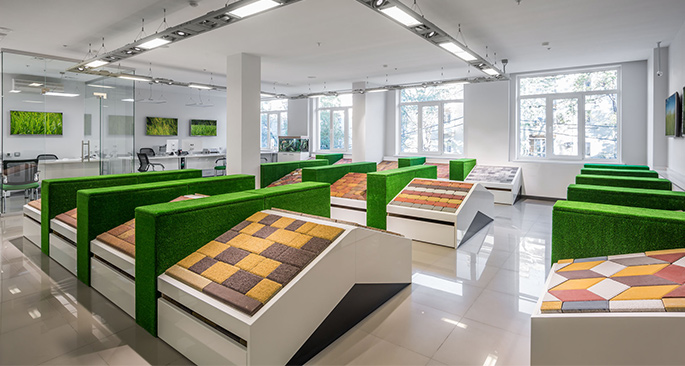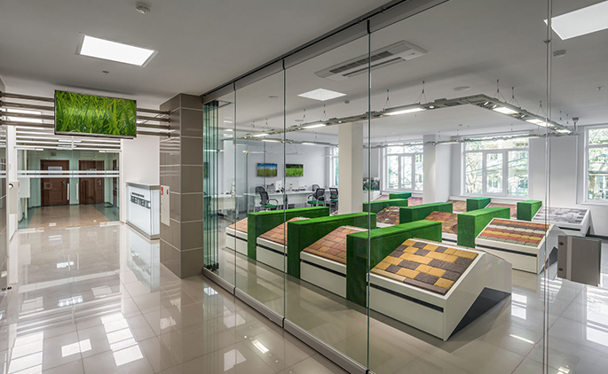 Сразу за стойкой расположен кабинет начальника отдела продаж, а по центру располагается шоу-рум с выставочными образцами продукции. С одной стороны шоу-рум открыт для посетителей и потенциальных клиентов, а с другой стороны это пространство должно быть выделено в отдельный сегмент. Сочетание светлых и стеклянных поверхностей, вкупе с освещением каждого фрагмента покрытия, создают наилучший фон для восприятия образцов продукции. В новом демонстрационном зале посетитель видит повернутые к нему фрагменты покрытия, которые разделены зелеными «кустами» для удобства восприятия.